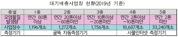 지금까지 연간 대기오염발생량이 10톤 이상인 대형사업장(1∼3종 사업장)은 굴뚝자동측정기기(TMS)를 부착, 오염물질 배출농도를 실시간으로 관리해 오고 있다. 그러나 연간 발생량이 10톤 미만인 소규모 사업장은 방문 점검에 의존하는 등 효율적인 관리가 어려웠다.