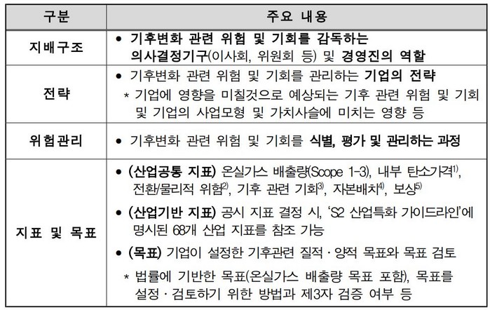 적용 범위는 기후변화에 따른 물리적‧전환 위험 등 기업이 노출되는 기후관련 위험 및 기회를 제공한다.