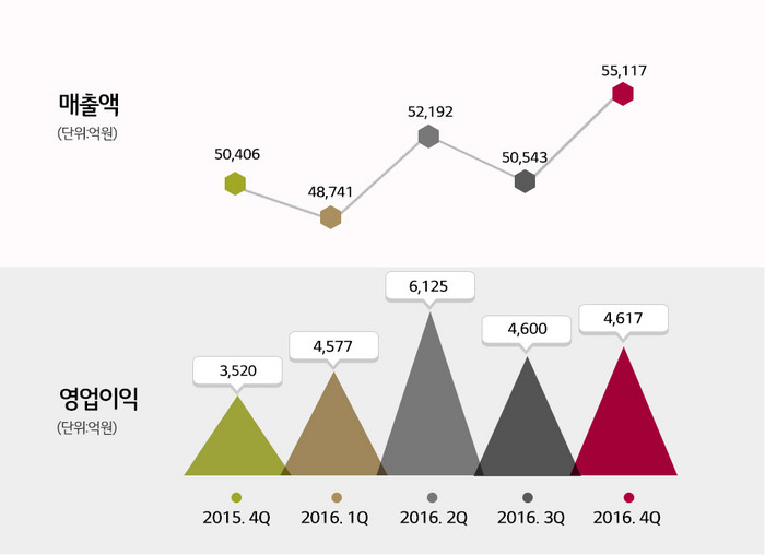 한편 지난 4분기 실적은 ▲ 매출 5조 5117억원 ▲ 영업익 4617억원 ▲ 순익 2700억원을 달성했다.