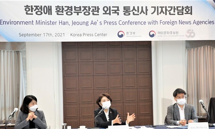 한정애 환경부 장관이 17일 서울 중구 프레스센터에서 국내에 상주하고 있는 10여 곳 외국통신사 기자간담회를 통해 한국판 그린뉴딜정책 소개와 기후위기시대에 환경정책을 중요성을 알렸다.