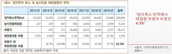 정치권에서 문제를 제기한 자유롭지 못하고 있다. 농어촌 지역에 태양광을 대대적으로 실시하면서 논밭에 태양관 패널만 산중턱에서 논밭까지 설치되고 있다. 흉물이 된 태양광 발전소는 곳곳을 파먹고 있어 주변 자연경관을 훼손이 심각하다.