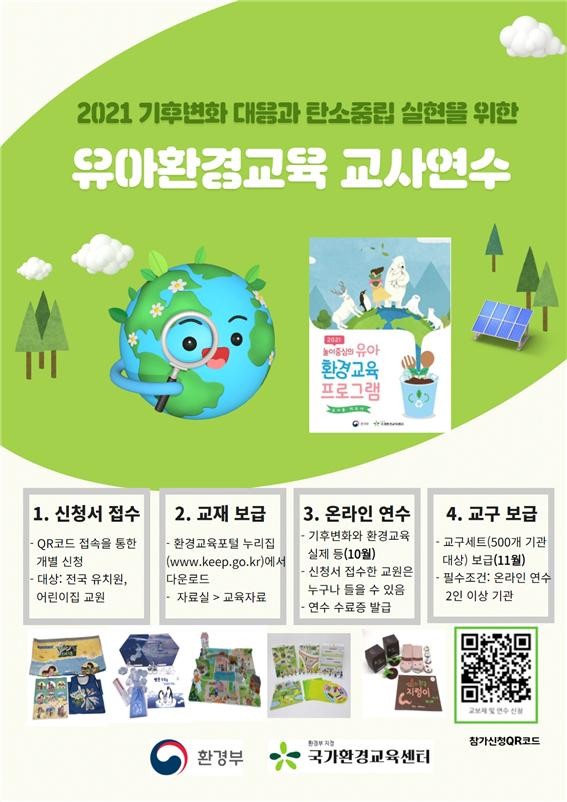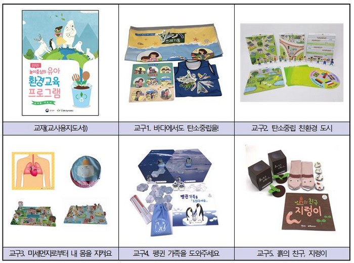 환경부는 연수 종료 후에 연수 이수자가 소속된 유치원.어린이집 500곳을 선정 '2021 유아환경교육 과정(프로그램) 교사용 지도서'안에 담긴 교구세트(4~5종)를 보급 환경교육 확산을 도모할 계획이다.