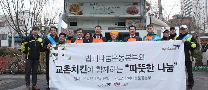 서울시 동대문구에 위치한 밥퍼나눔운동본부를 찾은 교촌은 무의탁 어르신과 노숙인 600여명을 대상으로 대표메뉴 중 하나인 살살치킨을 제공했다. 이번 나눔행사에 교촌을 비롯한 채선당, 바르다김선생 등 주요 프랜차이즈 업체가 참여해 어려운 이웃과 정을 나누는 뜻깊은 시간을 가졌다.
