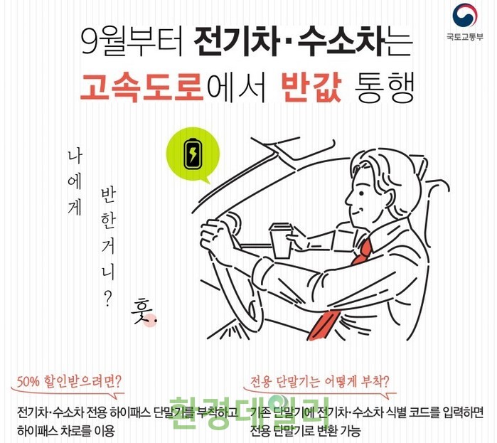 9월부터는 전기차, 수소차(하이브리드 제외)의 고속도로의 통행료를 50% 할인하는 등 전기차 이용 활성화를 위한 다각적인 조치를 추진하고 있다.