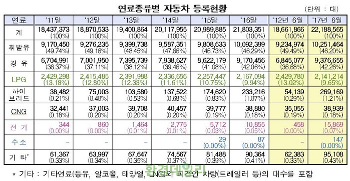 2017년 6월 말 기준 국내 자동차 등록대수가 2200만대를 돌파했다. 상대적으로 전기자동차는 5년만에 35배 증가하는 등 성장세를 이루는 것으로 나타났다.