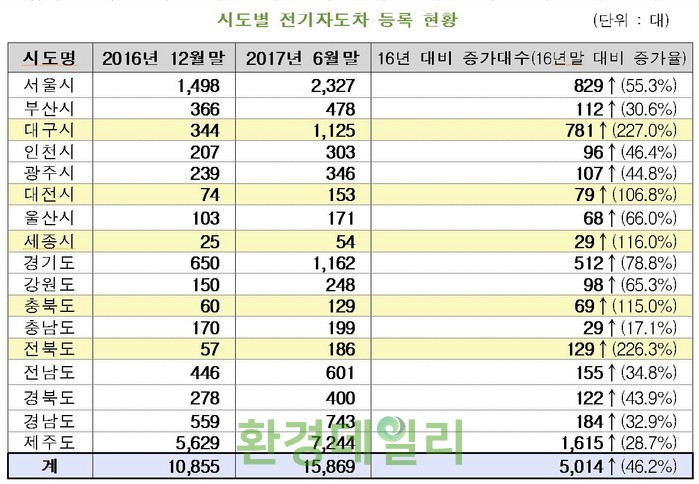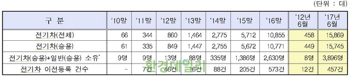 국토부는 미세먼지 저감대책과 관련, 관심을 받고 있는 친환경차의 등록현황을 보면, 2012년 6월말 458대이었던 전기차는 정부의 친환경차(Green Car) 보급 확대 정책에 따라 2017년 6월말에 1만5869대로 5년 만에 약 35배 증가했다.