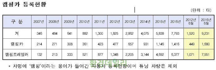 이번 통계에서는 레저 및 캠핑문화 활성화로 캠핑카의 등록대수가 계속 증가하고 있음도 확인할 수 있었다. 캠핑카 등록대수 추이를 보면 2012년 6월 말 1520대였으나 6월말 기준 등록대수가 9231대로 거의 5년 만에 약 6배 늘었다.