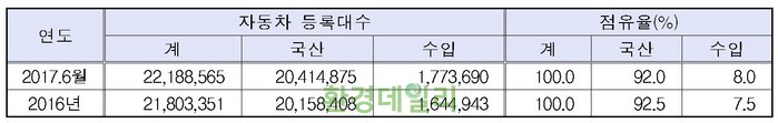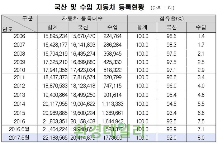 전체 등록차량 중 국산차 대비 수입차의 비율은 92:8(2041만대 : 177만대)로서 수입차의 비율은 지속적인 증가세를 보이고 있다. 이 수치는 지난해말 대비 수입차 비중은 7.5%에서 8.0%로 소폭 늘었다.