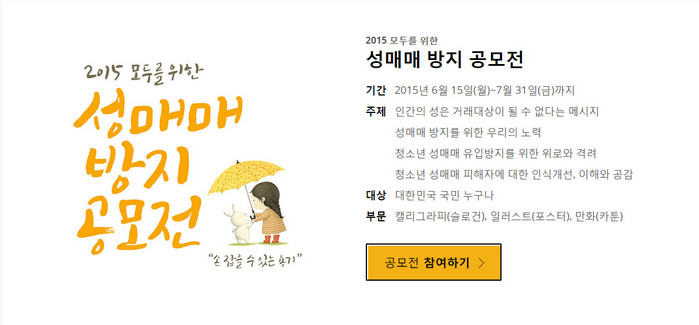 [화학신문 온라인팀] 여성가족부(장관 김희정)가 9월 19일에서 25일까지 진행되는 제1회 성매매 추방주간을 맞아 국민이 제안한 성매매방지 아이디어를 활용하기 위해 6월 15일(월)부터 7월 31일(금)까지 '2015년 성매매방지 공모전'을 진행한다.
