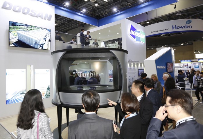 두산중공업은 이번 전시회에서 보일러, 터빈, 해수담수화 플랜트 등을 3D 홀로그램으로 구현하고, 가상현실(VR, Virtual Reality) 체험관을 별도로 마련해 두산의 생산현장을 실제로 둘러보는 것 같은 생생한 체험을 관람객에게 제공했다.