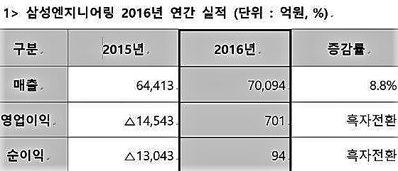 삼성엔지니어링은 25일 잠정실적공시를 통해, 2016년 연간 매출 7조 94억원, 영업익 701억원, 순익 94억원의 영업실적을 기록했다고 밝혔다. 매출은 전년대비 8.8% 증가했고, 영업익과 순익은 각각 흑자전환했다. (한국채택국제회계기준 연결)