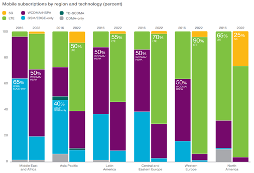 아시아 태평양 지역은 2022년까지 전체 모바일 가입의 10%가 5G에 가입하며 두 번째로 빠르게 성장할 것이다. 2016년에서 22년 동안 중동과 아프리카는 GSM/EDGE 전용 가입이 대다수를 이루는 지역에서 WCDMA/HSPA 및 LTE 가입이 80%를 차지하는 지역으로 급격한 변화를 겪을 것이다.
