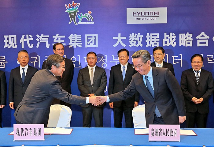 ▲현대자동차는 지난해 11월 8일 구이저우성 구이양시 국제생태회의센터에서 천민얼 구이저우성 당서기와 정의선 부회장 등 양측 관계자들이 참석한 가운데 현대차 빅데이터센터 구축을 위한 전략 합작 협의서를 공식 체결했다 |