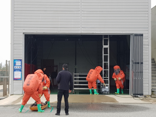 유해화학물질 사고 시 단계별 대응 절차로는 △드론 활용한 누출된 화학물질 정보파악 및 현장지휘 △화학보호복(Level A) 착용 및 신속대응 △누출물질 차단 및 인명 구조 순으로 진행했다.