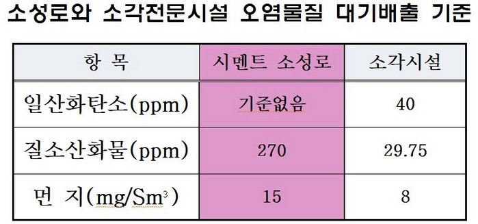 이들이 발끈한 핵심은 소각전문시설과 시멘트 소성로는 '잔류성유기오염물질 관리법'에서 다이옥신 배출허용기준을 0.1나노그램으로 동일하게 적용받고 있는 시설이다.