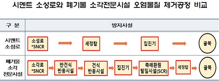 소각전문시설과 시멘트공장 소성로의 설비의 차이가 진위여부의 열쇠다. 소각전문시설은 대기오염물질 저감을 위해 6단계의 방지시설을 갖추고 오염물질 배출을 최소화하고 있다. 그러나 시멘트 소성로는 3단계 방지시설로 가동되고 있어 오염물질 방지체계에서도 소각전문시설과 비교해 현격히 부실하게 관리되고 있는 시설이다.