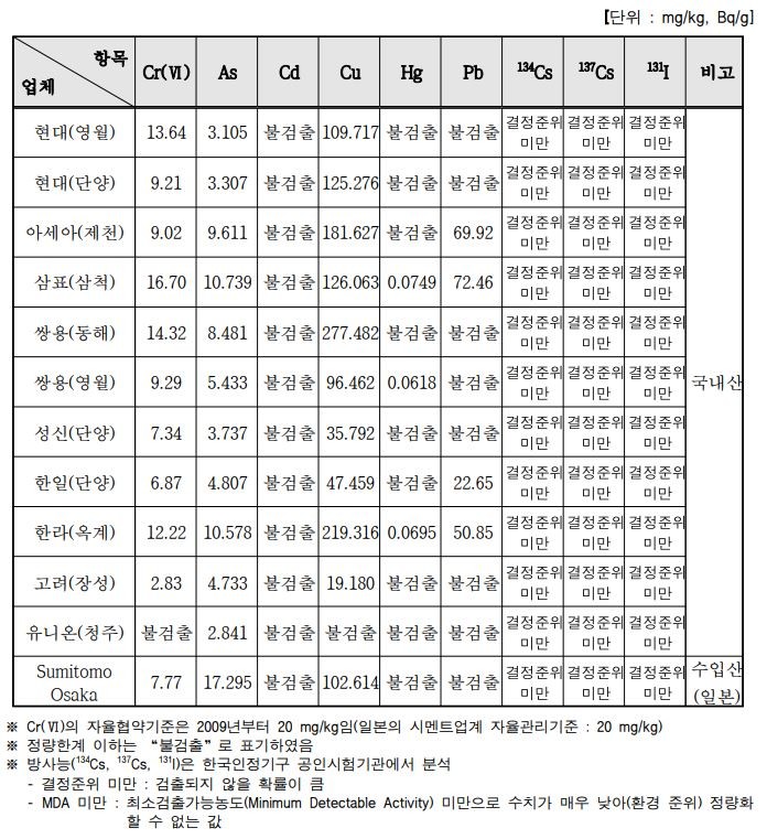 이미 알려진대로, 국내외 시멘트 12여개사(수입품 포함) 제품에 대한 6가 크롬을 비롯해 여러가지 중금속 함유를 관찰차원에서 성분 분석후 일반인에게 알림성격으로 공개만 하고 있는 수준이 머물고 있다.