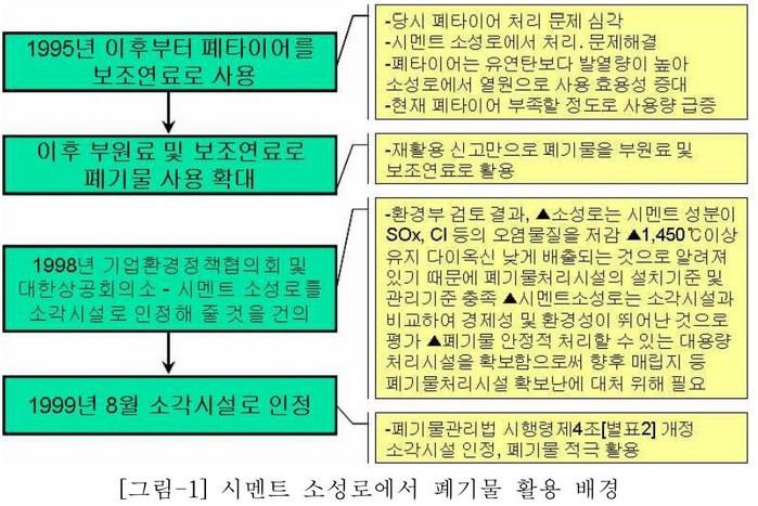 앞서, 환경부는 전국에 방치 및 불법폐기물에 대한 처리를 시멘트 공장 소상로를 통해 대부분을 소각처리하도록 강수를 뒀다. 물론 소각과정에서 쏟아내는 막대한 양의 재는 시멘트 원료를 공급된다.