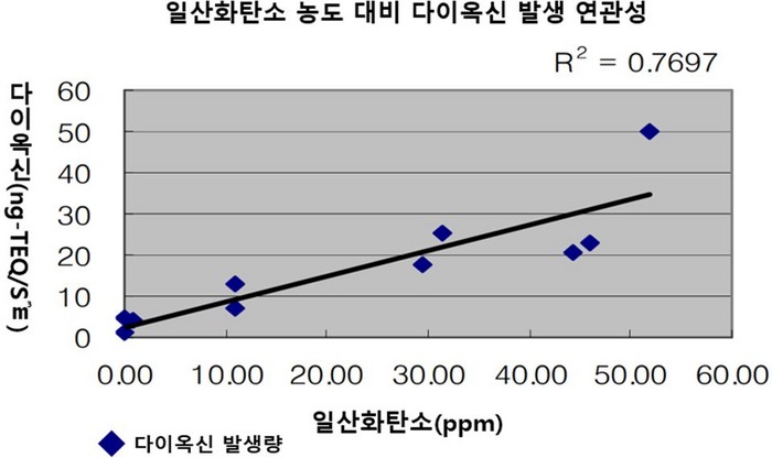 이같은 근거로 제시한 자료는 한국산업기술시험원은 일산화탄소(co)는 불완전연소로 발생되며, 불완전연소 시 다이옥신 발생 원인이 되는 전구물질 생성을 유발하기 때문에 일산화탄소 농도와 다이옥신의 발생량이 연관성이 있다고 발표했다.