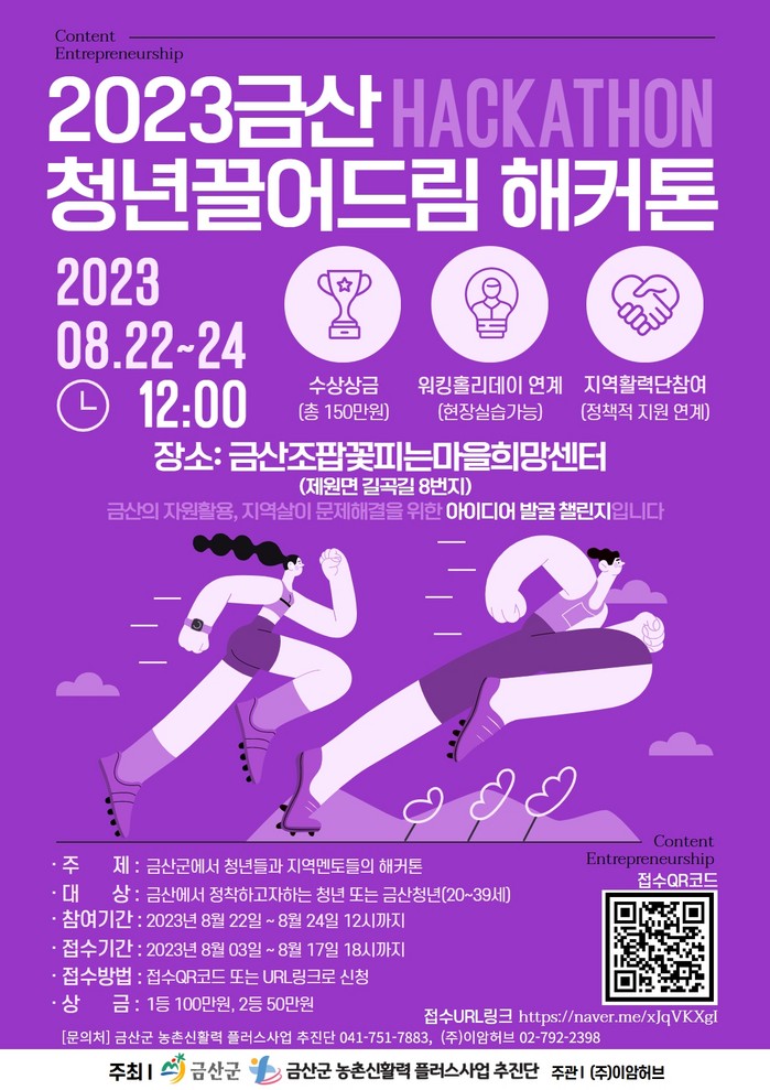 (주)이암허브는 '2023금산 청년끌어드림 청년창업자 발굴캠프'사업으로 8월 30일~31일 양일간 1박일 금산 조팝꽃피는 마을에서 개최한다.