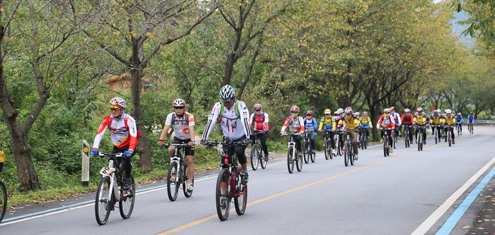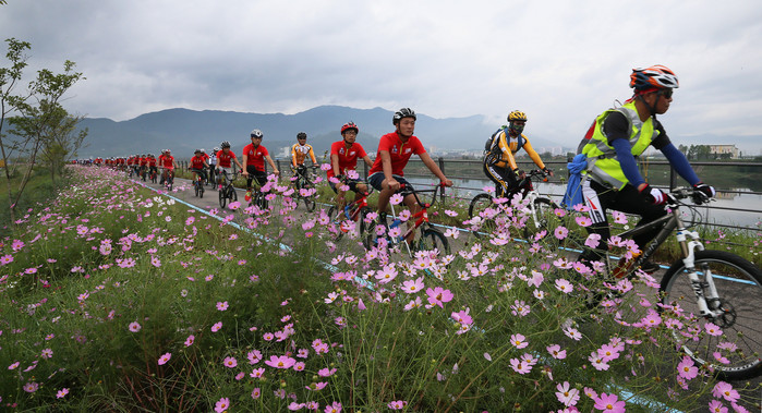 [화학신문 이수진 기자]전라남도 주최 남도길 국제자전거랠리 대회에 참가한 6개국 500여명의 자전거 동호인들이 구례에서 광양까지 이어지는 첫 번째 코스를 코스모스 가득한 구례군 자전거길(벚나무 가로수길)을 섬진강을 옆에 끼고 지리산을 바라보며 가을을 만끽하며 달려가고 있다.