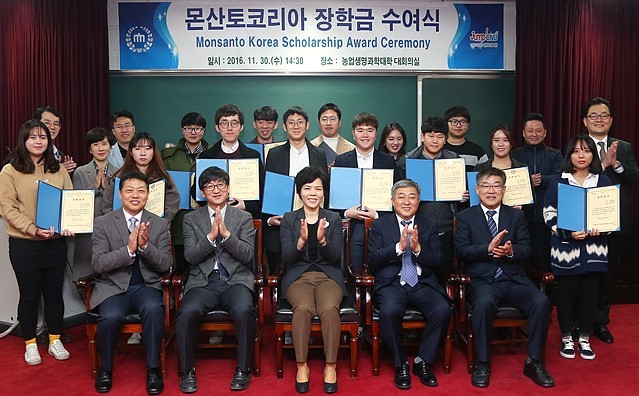[화학신문 유혜리 기자]몬산토 코리아는 국내 농업 인재 양성을 지원하기 위해 30일 충남대학교 농업생명과학대학에 총 2500만원의 장학금을 전달했다고 30일 밝혔다.