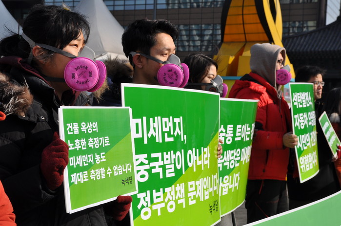 ▲국내외 환경시민단체, 그린피스, 환경운동연합, 녹색연합 등은 미세먼지와 황사에 섞인 발암물질이 자동차 배기가스 등으로 인해 발생된다며 새로운 대안이 절실하고 꾸준하게 캠페인을 펼치고 있다. © 화학신문 |