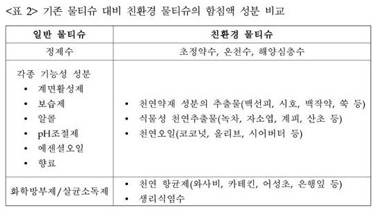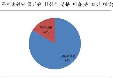최근 출원되고 있는 친환경 물티슈는 정제수로는 온천수, 약수, 해양 심층수 등을 사용하고, 첨가물로는 쑥, 자소엽, 계피, 박하 등의 각종 천연 식물 추출물을 포함, 보습효과를 유지하면서 피부자극을 줄이는 효과를 내고 있다.