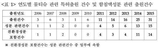 2015년에 총 31건이 출원됐는데, 이중 친환경 물질을 사용한 특허출원이 14건으로 다수를 차지하는 것으로 조사됐다.