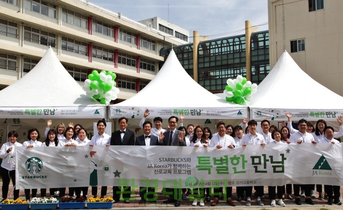한편, JA(Junior Achievement)는 1919년 미국에서 설립 UN 경제사회이사회로부터 특정분야 협의지위를 받은 단체다. 매년 전세계에서 120여개국에서 40만여명의 JA 자원봉사자들이 1000만명 이상의 학생들에게 무료로 시장경제와 직업을 교육하는 재능기부 활동에 참여하고 있다. 스타벅스는 한국과 미국, 홍콩에서 JA와 함께 활동을 전개하고 있다.