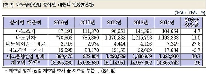 2015년 과학기술통계백서에 따르면, 특히 지난 5년 간 나노융합산업의 R&D 투자는 연평균 18.0% 성장한 것으로 나타나 국내 전체 연구개발비 연평균 성장률 9.8% 보다 높은 성장률을 보이고 있다.