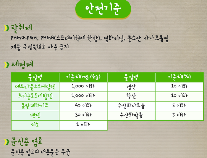 품목 대상은 세정제, 합성세제, 표백제, 섬유유연제, 코팅제, 접착제, 방향제, 탈취제, 방청제, 김서림방지제, 탈·염색제, 문신용염료, 소독제, 방충제, 방부제다.