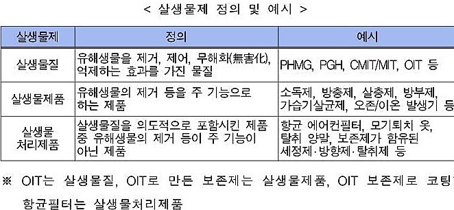 살생물제법은 관리될 제품은 자동차용 브레이크액, 실내용 바닥재, 수유패드, 온열팩, 가정용 항균 섬유제품, 항균 양탄자, 가죽 소파와 가죽 카시트, 쌍꺼풀용 테이프, 벽지 및 종이장판지, 전기담요 및 매트, 항균 전기 침대, 항균 전기온수매트, 이온 발생기가 포함됐다.