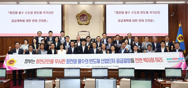 도의원 일동은 화천댐 용수의 수도권 반도체 국가산단 공급계획에 대하여 “발전용댐인 화천댐의 용수를 다목적댐처럼 사용함에도 발전용댐의 다목적활용이라는 모호한 표현으로 댐주변지역에 대한 합당한 지원을 회피하고 있고, 무엇보다도 화천댐 용수 활용 계획을 수립하는 과정에서도 당사자 지역인 화천군과 어떠한 협의도 없이 용수공급을 강행하기 위한 절차만 이행하고 있다.”고 주장했다.