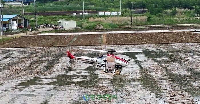 경주시 농업기술센터(소장 황영기)가 지난 해 부터 추진하고 있는 '무인헬기 벼 직파재배 기술보급 시범사업'의 생생한 현장이다.