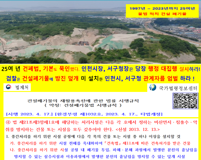 [화학신문 김영민 기자]"행정대집행 방식으로 방진벽 등 설치하고 건설폐기물 처리하라"