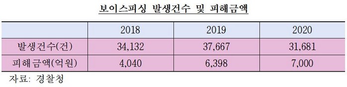 경찰청 자료에 따르면 지난해 보이스피싱 발생건수는 3만1681건으로 전년(3만7667건)에 비해 16% 정도 감소했으나 피해액은 7000억원으로 역대 최고 수준을 기록했다. 이는 오픈뱅킹의 영향도 일부 작용하는 것으로 추정할 수 있다.