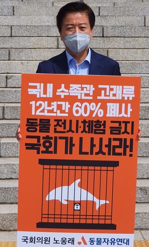 국회의사당 앞에서 더불어민주당 노웅래 의원과 동물자유연대가 14일 동물원수족관법 개정안 통과 촉구를 위한 1인 시위를 진행했다. 2009년부터 12년간 전시를 위해 국내에 수입한 고래류 61마리 중 37마리가 폐사했다. 이는 수족관에 들여온 고래류 중 60%가 넘는 수치다.