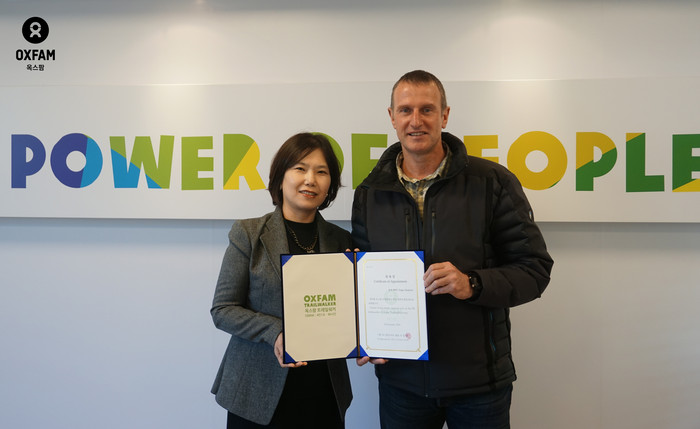 ▲2016년 12월 22일, 옥스팜 트레일워커 홍보대사 위촉식에서 위촉장을 들고있는 지경영 옥스팜코리아 대표(왼쪽)와 산악가이드 겸 사진작가 로저셰퍼드(오른쪽)의 모습. |