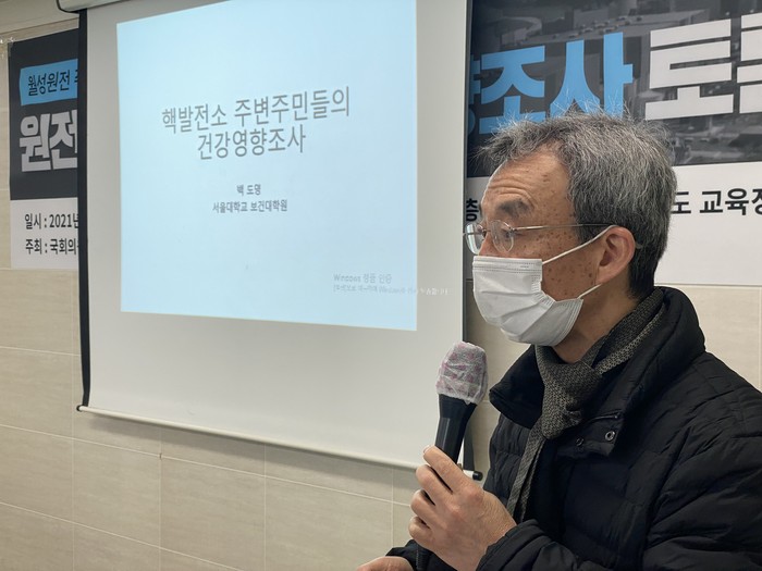 백도명 서울대 보건대학원 교수는 발제를 통해 "핵발전소 주변 주민 건강문제는 여전히 논란이 끊이지 않고 있다."며 "원전으로부터 방출되는 방사성물질이 어떤 물질인지 지금껏 어떻게 모니터링했는지 이런 환경에 사는 주민들이 사는 환경 문제는 없는지 봐야 한다."고 주장했다.