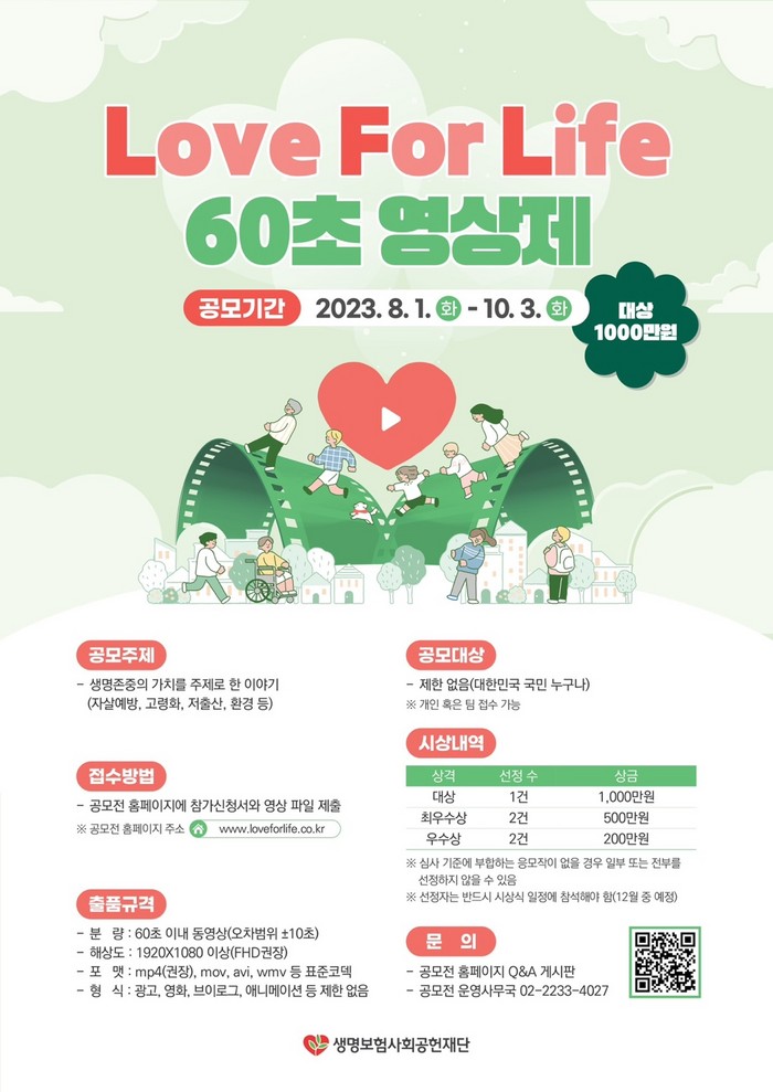 생명보험재단의 'Love For Life 60초 영상제'는 소중한 생명을 구한 사회 속 의인을 선발해 생명존중 문화를 확산시키는 '생명존중대상'의 문화예술 분야 신설 공모전이다.