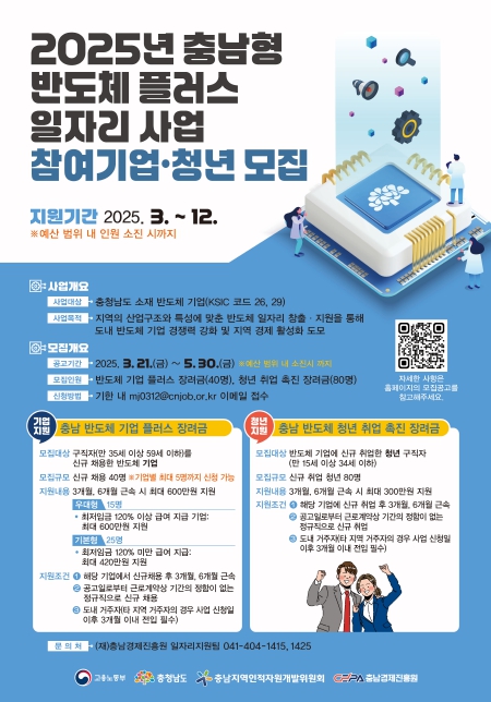 이번 사업은 충남 반도체 기업의 경쟁력 강화와 경제 활성화를 목표로, 고용노동부 공모에 선정돼 확보한 국비 5억2000만원에 도비 1억3000만원 등 총 6억5000만원의 예산이 투입되어 도내 반도체 산업 분야에서 120명 이상의 고용을 창출할 계획이다.
