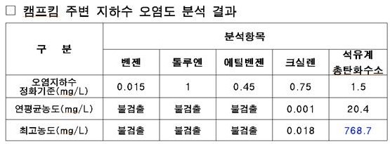 캠프킴 주변 석유계총탄화수소 허용기준치 512배 검출