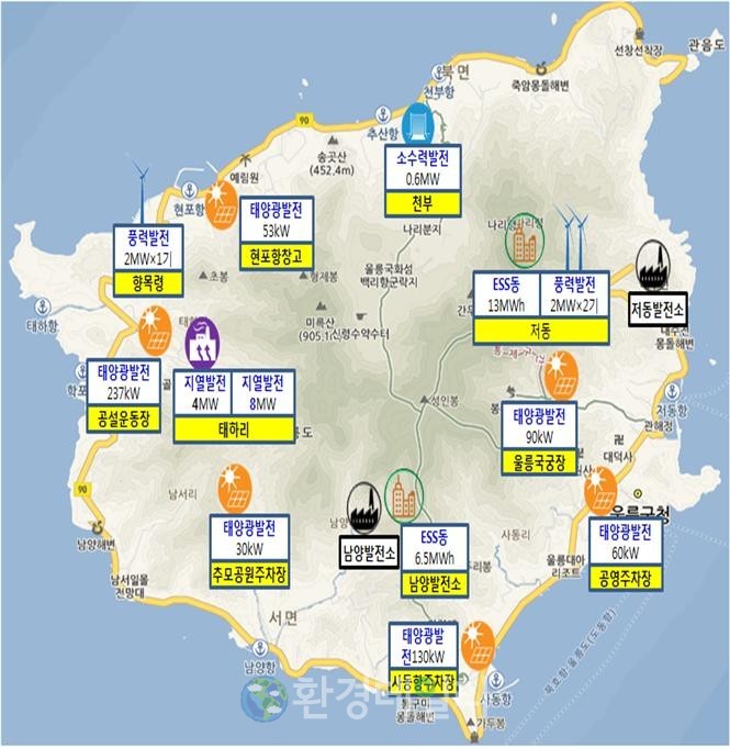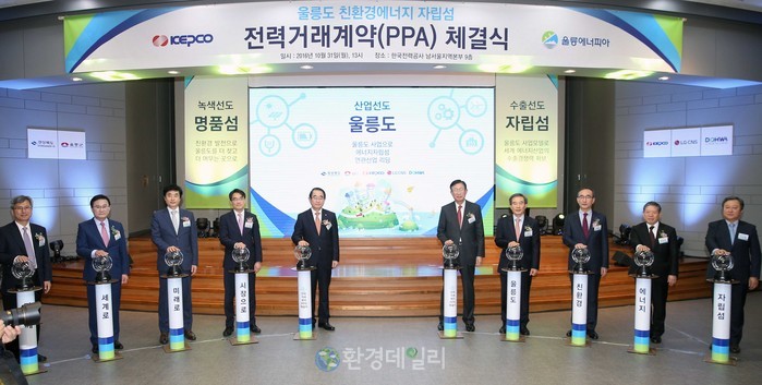 산업통상자원부는 10월31일, 한국전력 남서울본부에서 울릉도 친환경 에너지자립섬 본격 착수를 위해 에너지자립섬 사업자인 울릉에너피아와 한국전력공사간 전력거래계약(PPA)을 체결했다.
