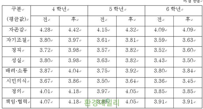성별에 따라서는 4학년은 남녀학생 모두 모든 항목에서 긍정적인 변화가 나타났다. 5학년의 경우 남학생은 정의 영역을 뺀 나머지 7가지 영역에서, 여학생은 4학년과 마찬가지로 모든 항목에서 인성점수가 향상됐다.