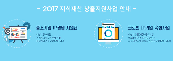 2017년 '지식재산 창출지원'사업은 전국의 성장잠재력 있는 중소기업을 대상으로 하는 지식재산 지원 사업으로 '글로벌 IP(Intellectual Property) 기업 육성' 및 '중소기업 IP 경영지원단'의 2가지 세부사업으로 구성된다.