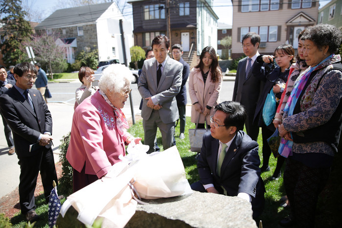 또한 위안부 피해자 할머니들과 함께 펠리세이즈파크 위안부 기림비를 방문, 헌화 및 추모의 시간을 가졌다. 이 과정에서 이옥선 할머니는 피켓에 있는 아베 총리의 사진을 가리키며 한 맺힌 목소리로 수차례 사죄를 요구하기도 해 추모에 참석한 이들의 눈시울을 붉히기도 했다.