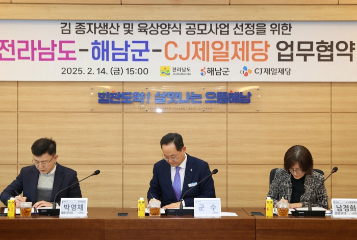 14일 열린 협약식에는 명현관 해남군수, 전라남도 박영채 해양수산국장, CJ제일제당 남경화 글로벌카테고리 연구담당(경영리더) 등 관계자들이 참석한 가운데, 김 육상양식 기술 개발과 산업 육성에 기관과 기업이 긴밀히 협력해 나가기로 했다.