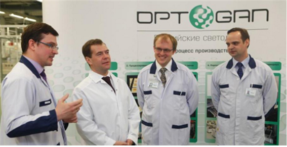 | ▲ 2011년 3월, 메드베데프 러시아 대통령(사진 두 번째)의 Optogan 상트페테르 공장 LED 생산 현장 방문 |