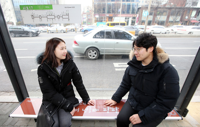 서울 서초구(구청장 조은희)가 겨울철 버스를 기다리는 주민의 불편을 덜어주기 위해 이용객이 많은 서래초등학교 등 버스정류장 9개소에 최근 설치한 사계절 '온돌의자'가 주민들로부터 큰 인기를 얻고 있다.